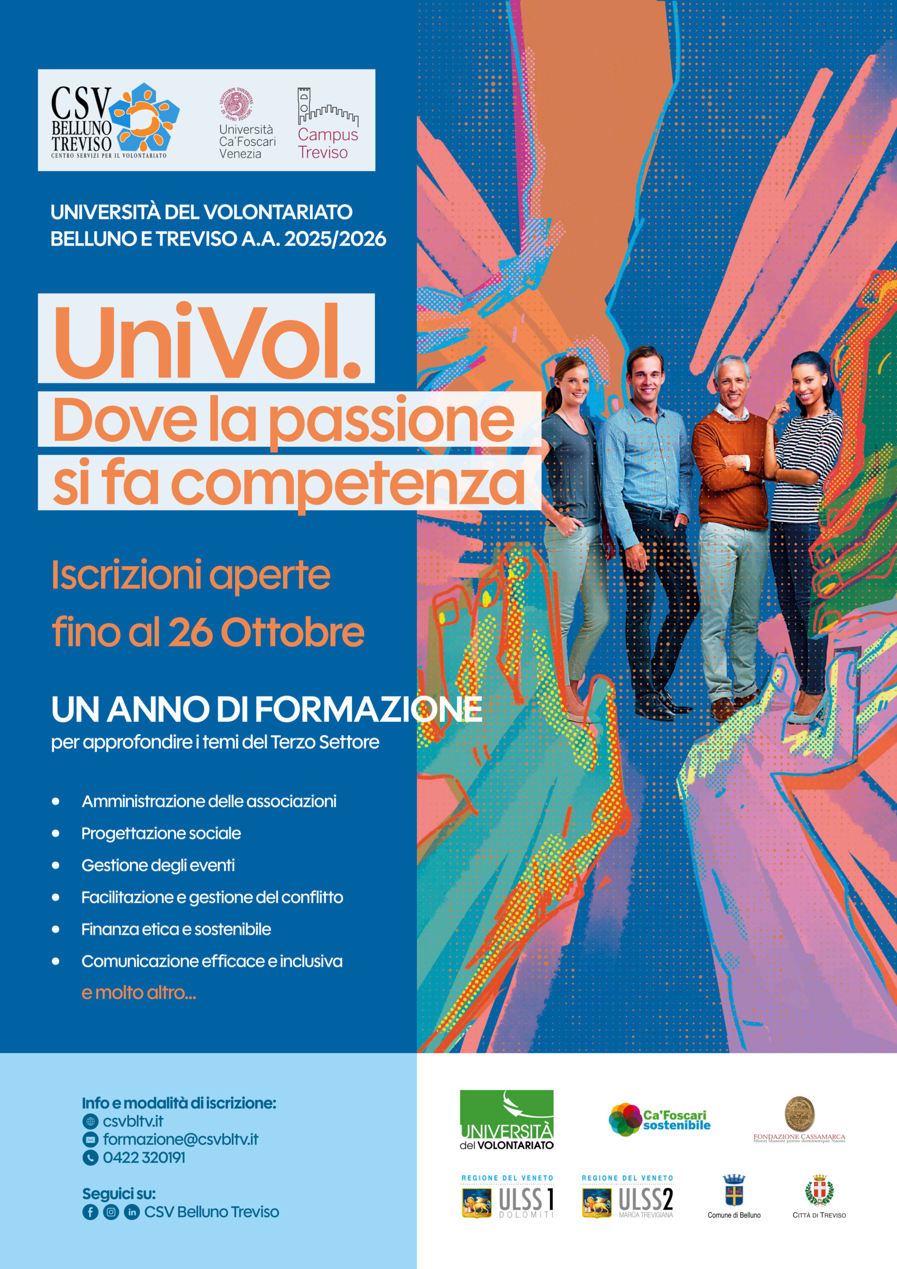 Sono ufficialmente aperte le iscrizioni per l’anno accademico 2025/2026 dell’Università del Volontariato (UniVol.) di Belluno e Treviso, promossa dal CSV Belluno Treviso in collaborazione con l’Università Ca’ Foscari Venezia – Campus di Treviso.