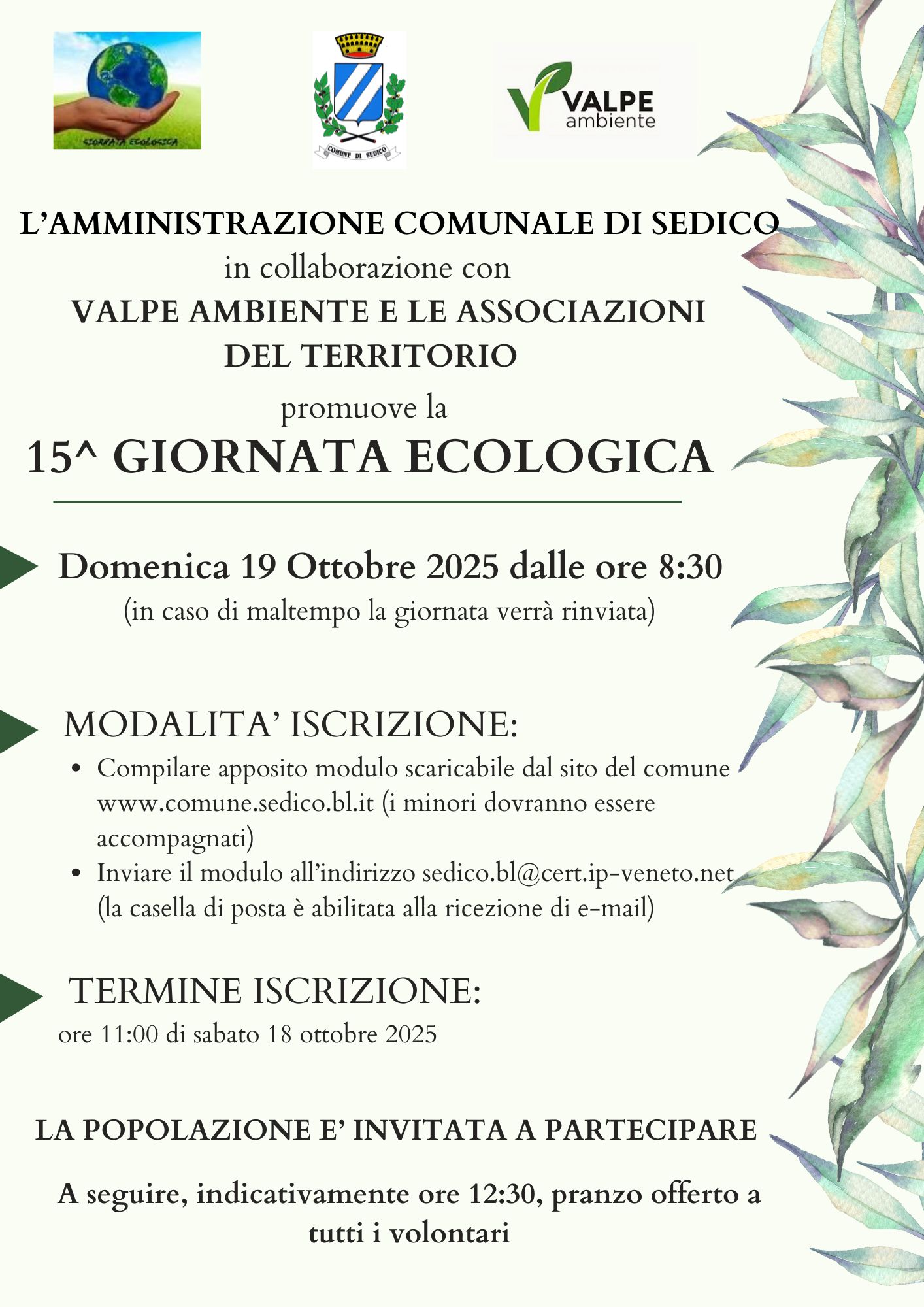 Si svolgerà domenica 19 ottobre 2025, con inizio alle ore 8:30, la 15^ Giornata Ecologica, un’occasione aperta a tutta la cittadinanza per contribuire in modo concreto alla cura dell’ambiente. In caso di maltempo, l’iniziativa verrà rinviata a data da destinarsi. Al termine delle attività, indicativamente verso le ore 12:30, sarà offerto un pranzo a tutti i volontari partecipanti.
