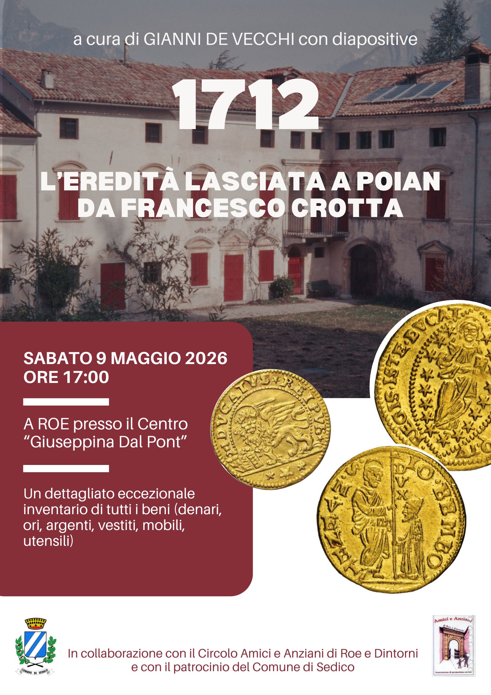 Sabato 9 maggio 2026 si terrà a Roe presso il Centro "Giuseppina Dal Pont" la conferenza con diapositive dal titolo "1712: l'eredità lasciata a Poian da Francesco Crotta" a cura di Gianni De Vecchi. Verrà presentato un dettagliato inventario di tutti i beni (denari, ori, argenti, vestiti, mobili, utensili).