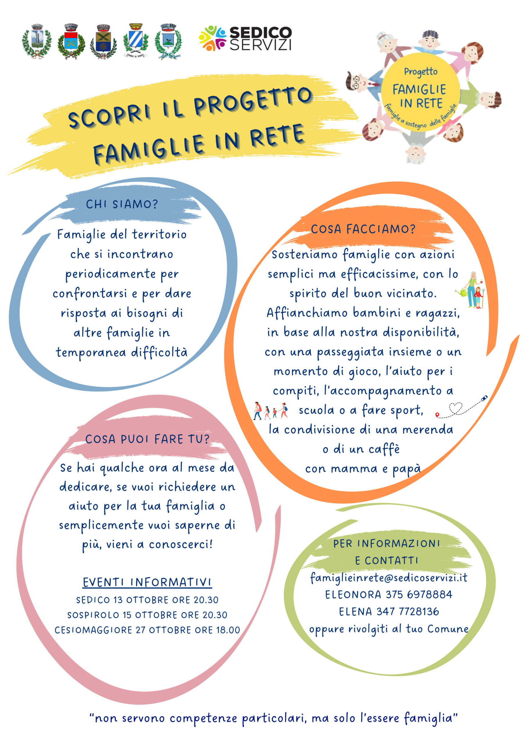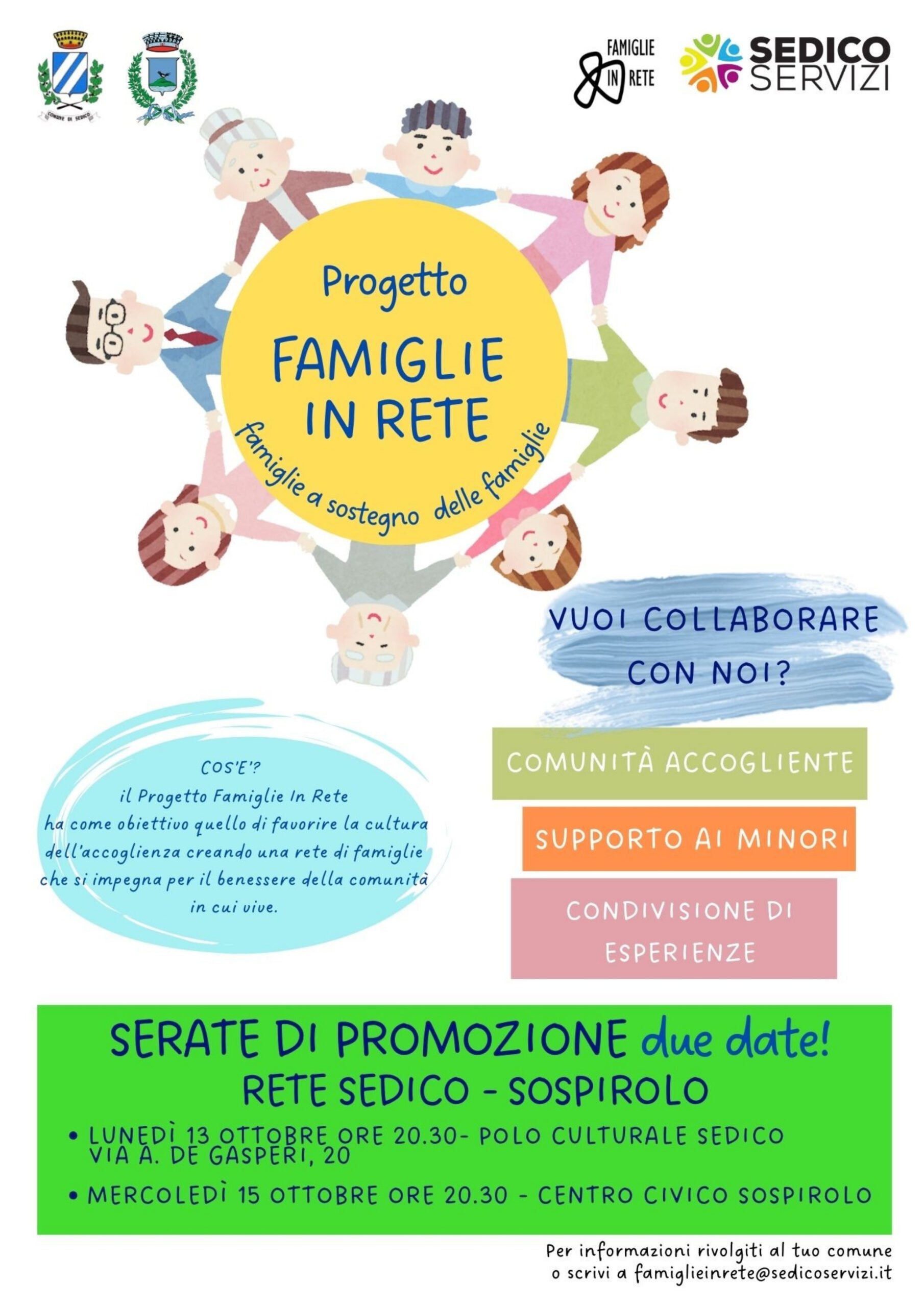 L’Amministrazione Comunale di Sedico e l'Azienda Speciale Sedico Servizi, in collaborazione con le Amministrazioni Comunali coinvolte ovvero i Comuni di Cesiomaggiore, San Gregorio, Santa Giustina, Sedico e Sospirolo, invita la cittadinanza a partecipare alla serata di promozione e informazione del progetto "Famiglie in Rete" che si terrà lunedì 13 ottobre alle ore 20.30 presso il Polo Culturale di Sedico, in Via A. De Gasperi 20.