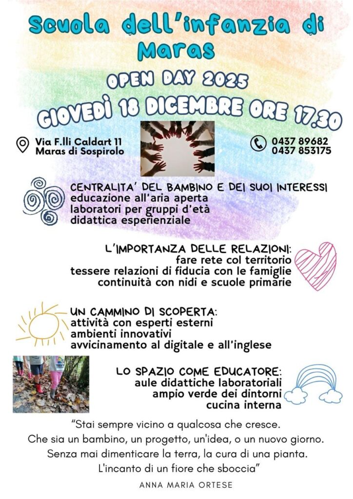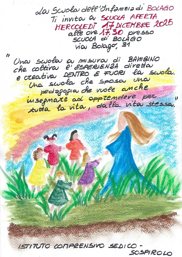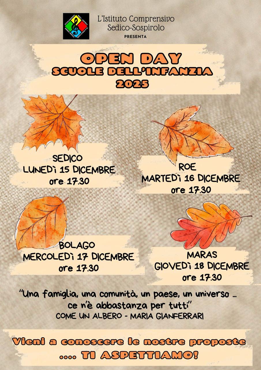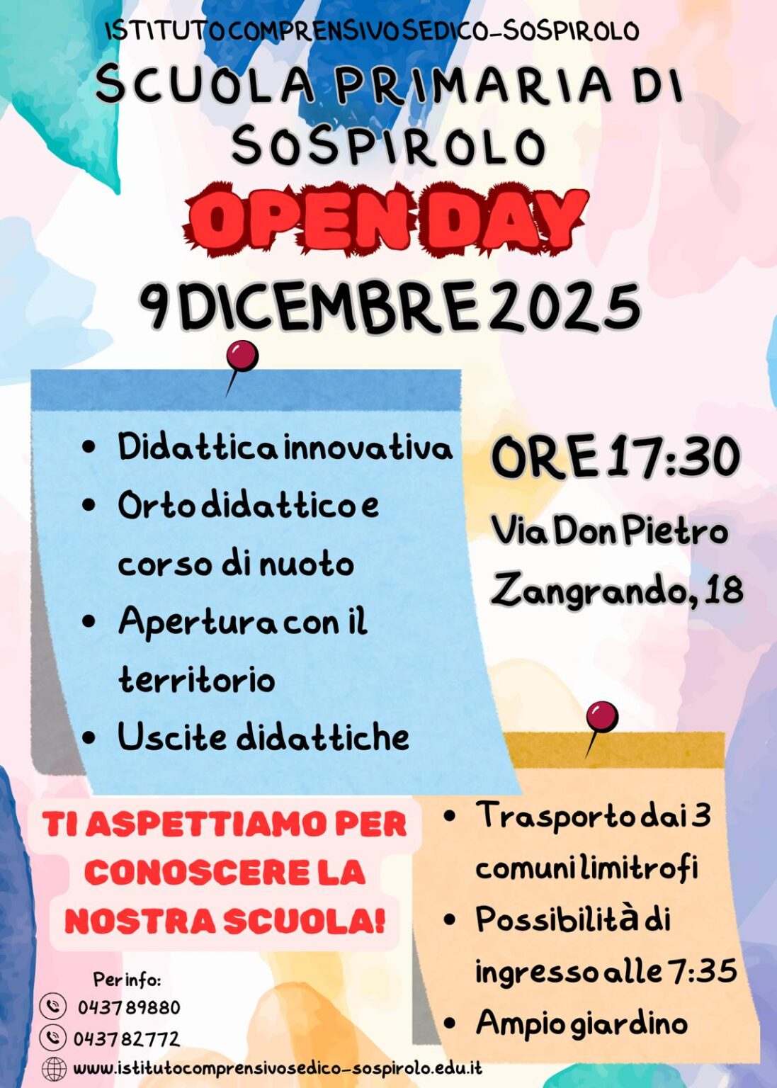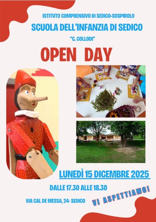 L’Istituto Comprensivo Sedico–Sospirolo organizza, nel mese di dicembre 2025, una serie di incontri di Scuola Aperta rivolti alle famiglie degli alunni che dovranno iscriversi per l’anno scolastico 2026/2027.