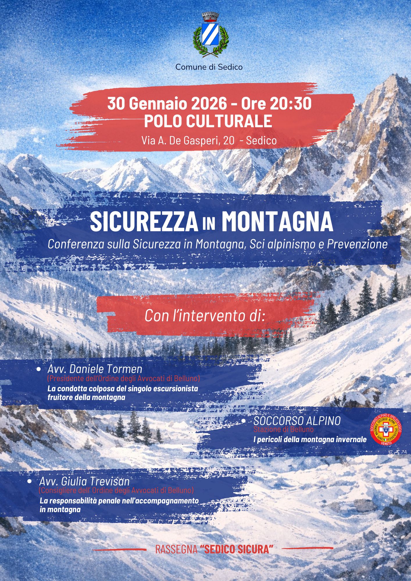 Venerdì 30 gennaio 2026, alle ore 20.30, presso il Polo Culturale di Sedico, si terrà una conferenza interamente dedicata alla sicurezza in montagna, con particolare attenzione allo sci alpinismo, alla prevenzione e alle buone pratiche da adottare in ambiente montano.