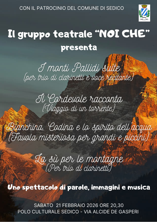 L’appuntamento è in programma sabato 21 febbraio 2026 alle ore 20.30 presso il Polo Culturale di Sedico, in via Alcide De Gasperi.