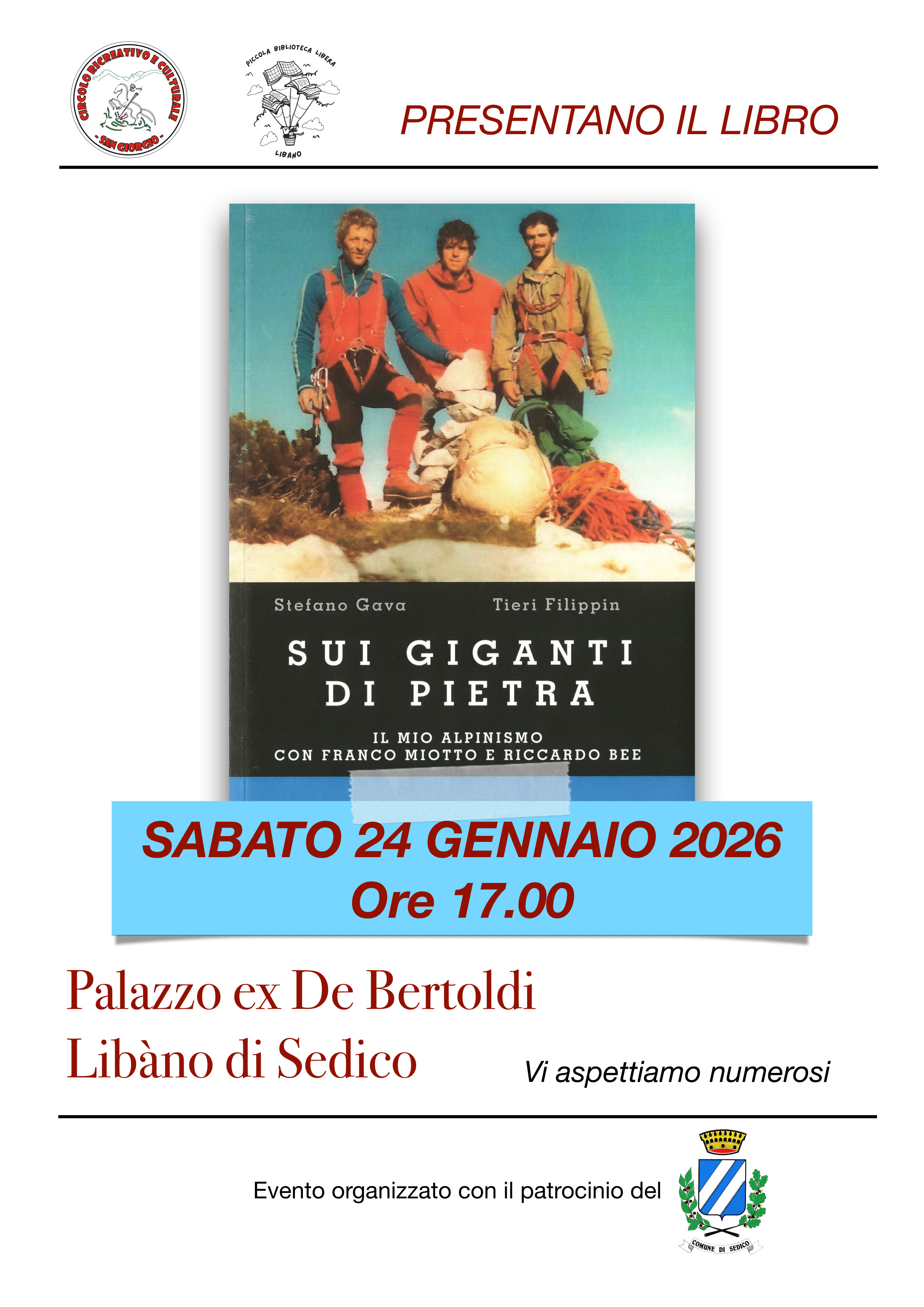 Sabato 24 gennaio 2026, alle ore 17.00, presso Palazzo ex De Bertoldi a Libàno di Sedico, si terrà la presentazione del libro Sui giganti di pietra. Il mio alpinismo con Franco Miotto e Riccardo Bee, di Stefano Gava e Tieri Filippin.